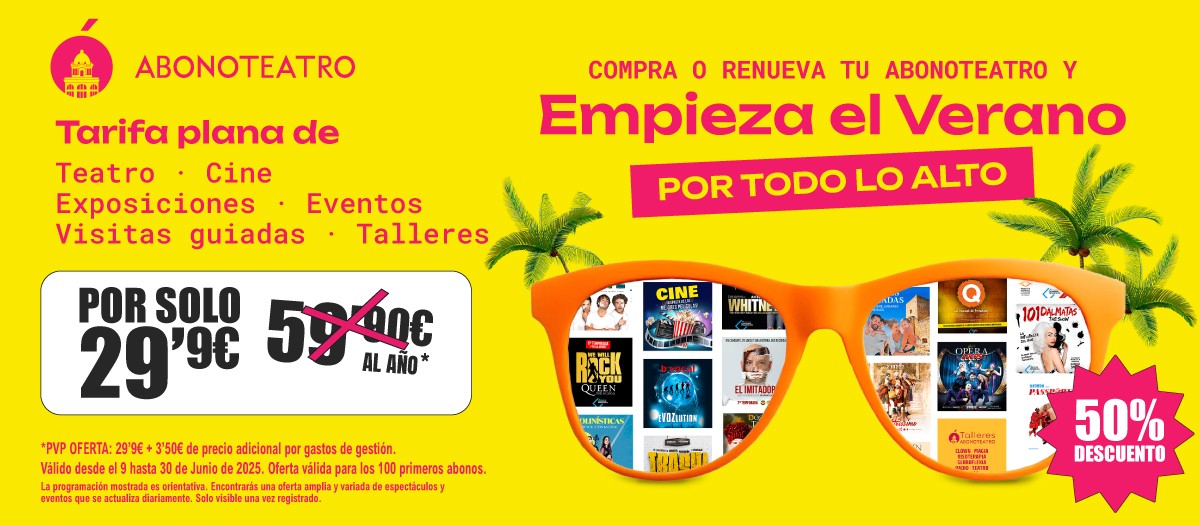 Del 9 al 30 de junio 2025 comprar o renovar tu Abonoteatro tan sólo te costará 29,9€, y recuerda que esta oferta va dirigida a todos los afiliados de ATYPE y sus familias.